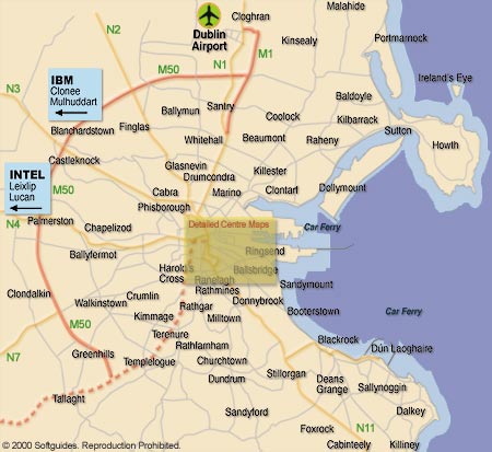 has some good maps such as this Big Scale Map of Dublin (41KB) and this More detailed Map I put together (254KB)* showing the city centre in the top left and the Donnybrook Road in the bottom left that leads to Stillorgan.